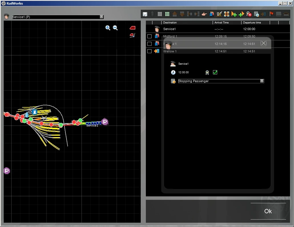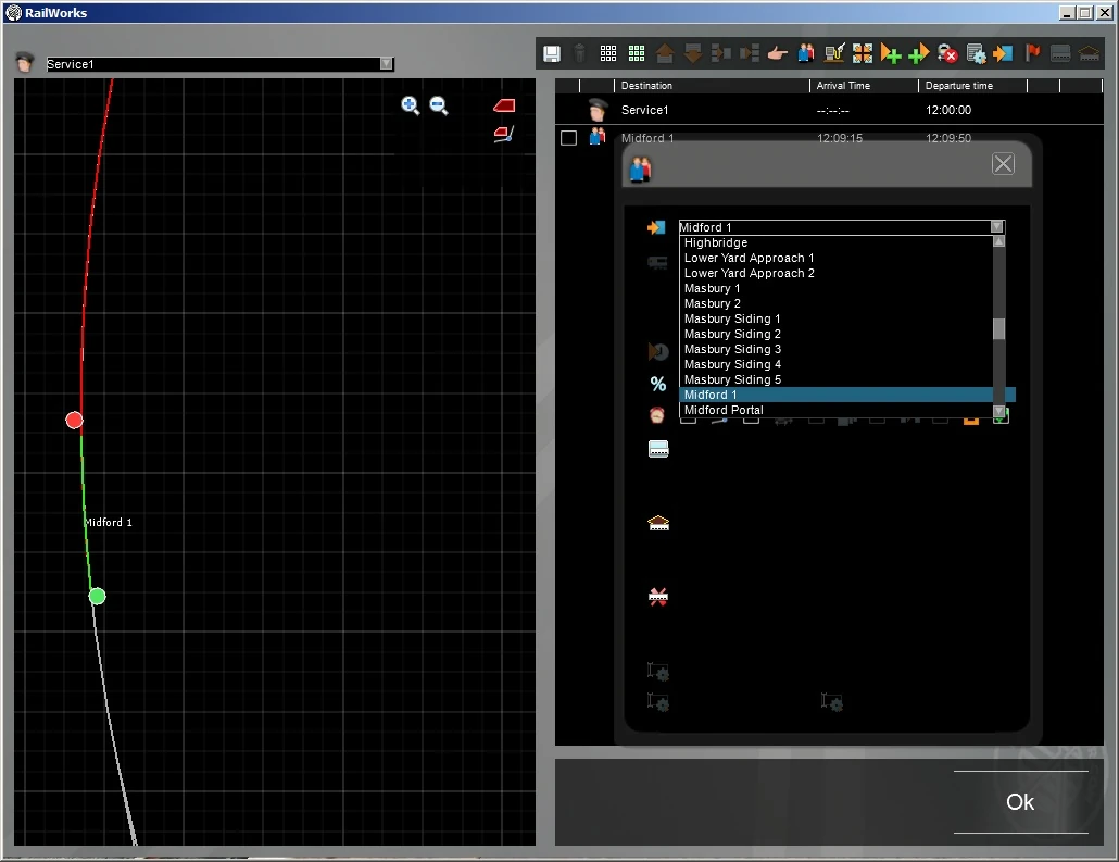 Choose the "people" symbol and this new window shows up. I've scrolled around the map to see what the next station is, and as it turns out it is Midford. So go through the list with all the possible stops and look for it. There are more things to adjust in this window, but let's keep it simple at this point.