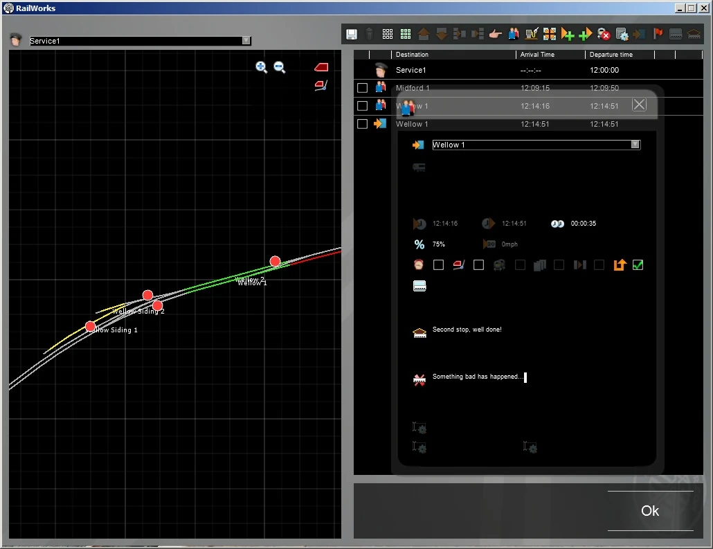 I already added the next stop "Willow 1" here, but to make the scenario complete we will also need a final destination for our train, so that we know where the scenario is finished. It is also nice for the player to know he has done the job good or bad, so I filled in the two according text boxes here.